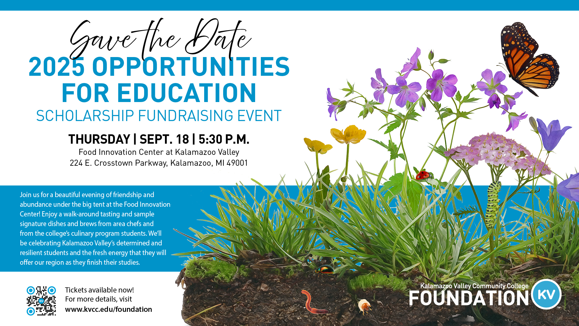 Join us at 5:30 p.m. Thursday, Sept. 18 for an evening of community, cuisine and celebration at the 20th Opportunities for Education (OFE) Scholarship Fundraising Event at Kalamazoo Valley Community College's Food Innovation Center, located at 224 E. Crosstown Parkway in downtown Kalamazoo. This annual gathering promises an unforgettable night under a big tent where friendship, food and philanthropy come together to support students.