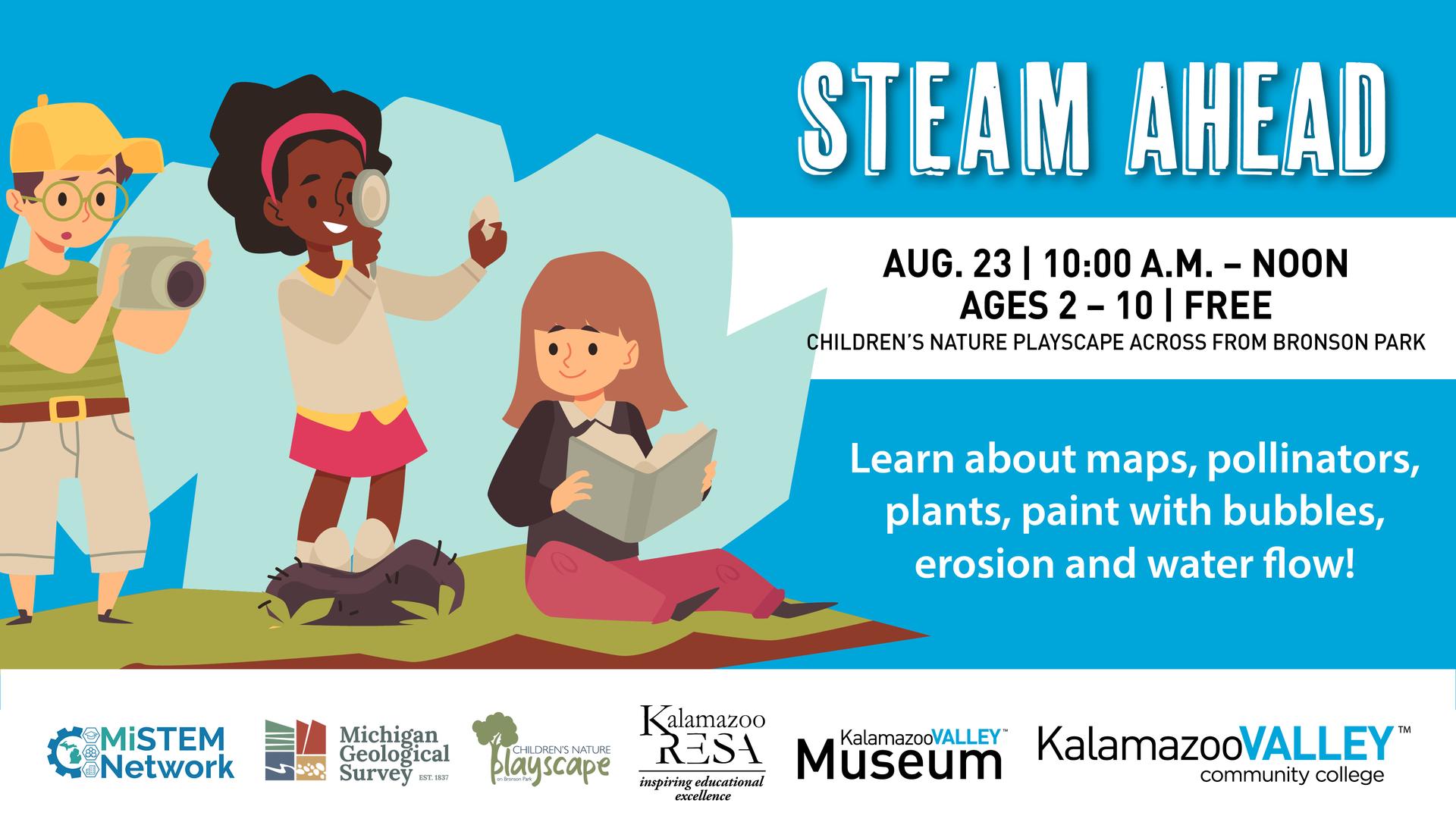 Join us Aug. 23 from 10 a.m. - noon at the Children's Nature Playscape across from downtown Kalamazoo's Bronson Park for our third annual STEAM Ahead event. At this event, children ages 2 - 10 can learn about maps, pollinators, plants, paint with bubbles, erosion and water flow!