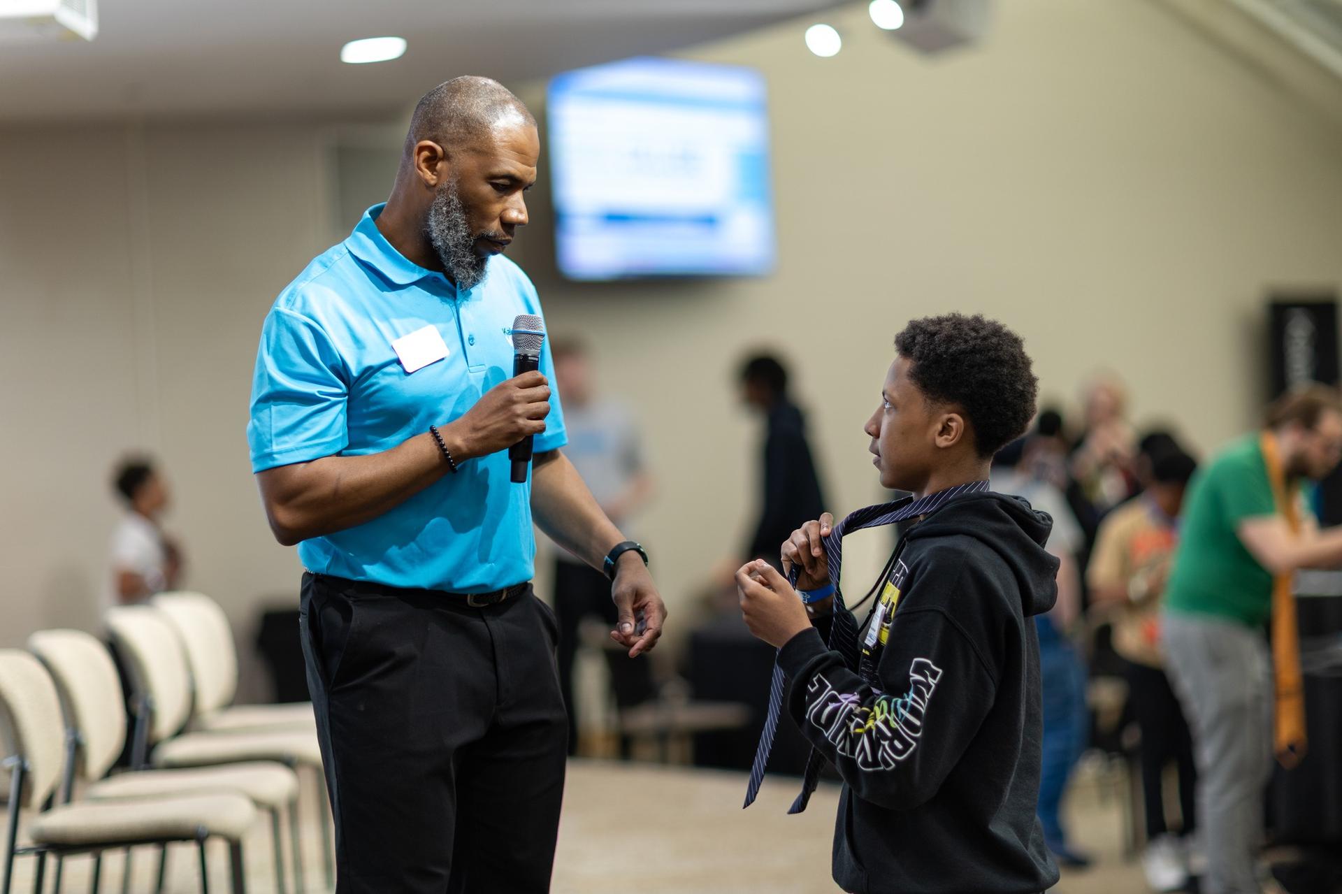 With a $500 mini-grant contribution from the KVCC Foundation, the Youth Transformative Leadership Summit held at our Texas Township Campus was a success! The Transformative Youth Leadership Summit is an impactful educational experience that empowers Kalamazoo Public Schools and Paramount Charter Academy middle-schoolers to be leaders by participating in interactive workshops engaging with college staff and community professionals. The event ended with a lesson for young men on tying a necktie.